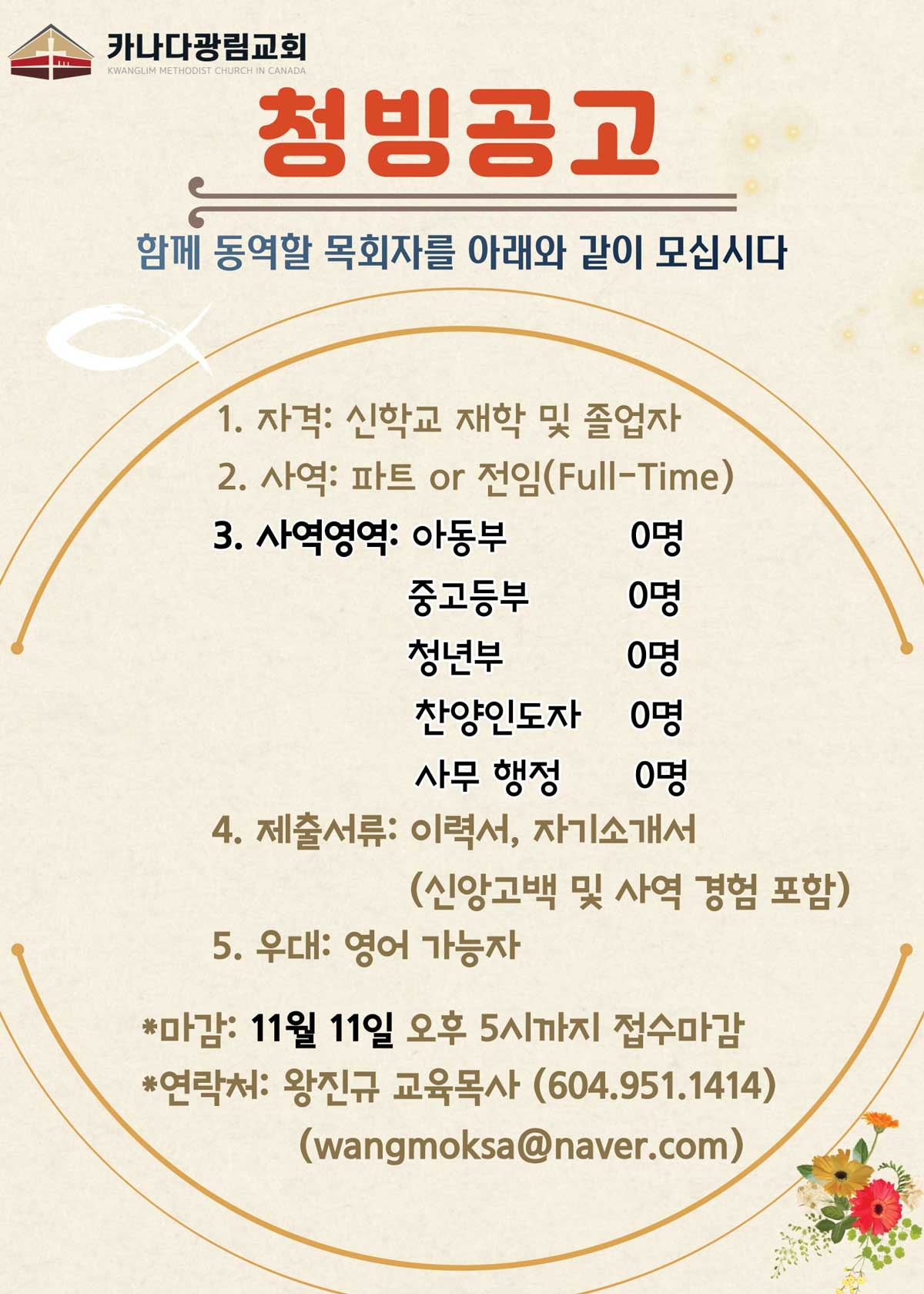 Home청빙 카나다광림교회 파트별 사역자 청빙 안내 [청빙] 카나다광림교회 파트별 사역자 청빙 안내 By admin 10월 29, 2021 카나다광림교회 파트별 사역자 청빙 안내 FacebookXWhatsAppEmailNaver Previous article[청빙] 노스쇼어아름다운교회 청빙 안내Next article[청빙] 위니펙 임마누엘 교회 청빙 안내 Advertisment - Advertisment - 최신 청빙 [청빙] 리치먼드 주안에 교회 동역자 청빙 4월 10, 2026 [청빙] 칠리왁 주님의교회 교육전도사 청빙(연장) 3월 20, 2026 [담임목사청빙] 레스브릿지 한인교회 담임목사 청빙 3월 13, 2026 [청빙] 토론토 동산교회 반주자 청빙 3월 13, 2026 Load more 인기 청빙 [청빙] 헤브론교회 교역자 청빙 안내(8/12, 청빙완료) 7월 29, 2021 [청빙] 토론토 큰빛교회 사역자 청빙 안내 11월 4, 2021 [담임목사청빙안내] 밴쿠버한인장로교회 담임목사 청빙 안내 3월 25, 2022 [청빙] 밴쿠버 지구촌교회 청빙 안내 8월 6, 2021 Load more