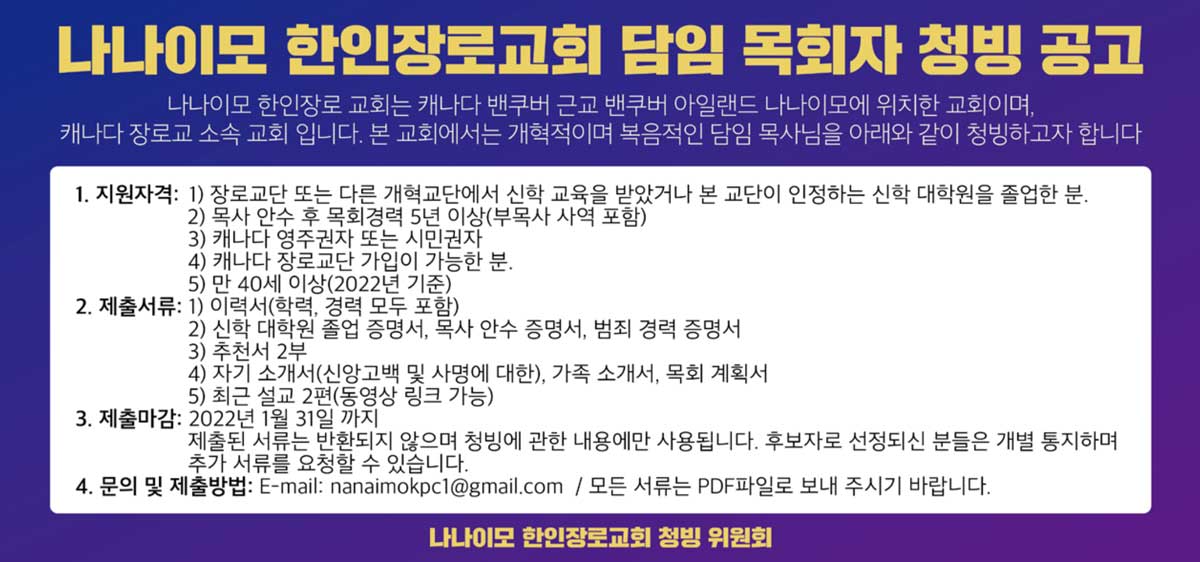 Home청빙 나나이모한인장로교회 담임목사 청빙 [청빙] 나나이모한인장로교회 담임목사 청빙 By admin 1월 7, 2022 [청빙] 나나이모한인장로교회 담임목사 청빙 FacebookXWhatsAppEmailNaver Previous article[청빙] 몬트리올 새생명장로교회 전임 교역자 청빙Next article[청빙] 나나이모한인장로교회 담임목회자 청빙 공고(제출마감 기한 연장) Advertisment - Advertisment - 최신 청빙 [청빙] 리치먼드 주안에 교회 동역자 청빙 4월 10, 2026 [청빙] 칠리왁 주님의교회 교육전도사 청빙(연장) 3월 20, 2026 [담임목사청빙] 레스브릿지 한인교회 담임목사 청빙 3월 13, 2026 [청빙] 토론토 동산교회 반주자 청빙 3월 13, 2026 Load more 인기 청빙 [청빙] 헤브론교회 교역자 청빙 안내(8/12, 청빙완료) 7월 29, 2021 [청빙] 토론토 큰빛교회 사역자 청빙 안내 11월 4, 2021 [담임목사청빙안내] 밴쿠버한인장로교회 담임목사 청빙 안내 3월 25, 2022 [청빙] 밴쿠버 지구촌교회 청빙 안내 8월 6, 2021 Load more