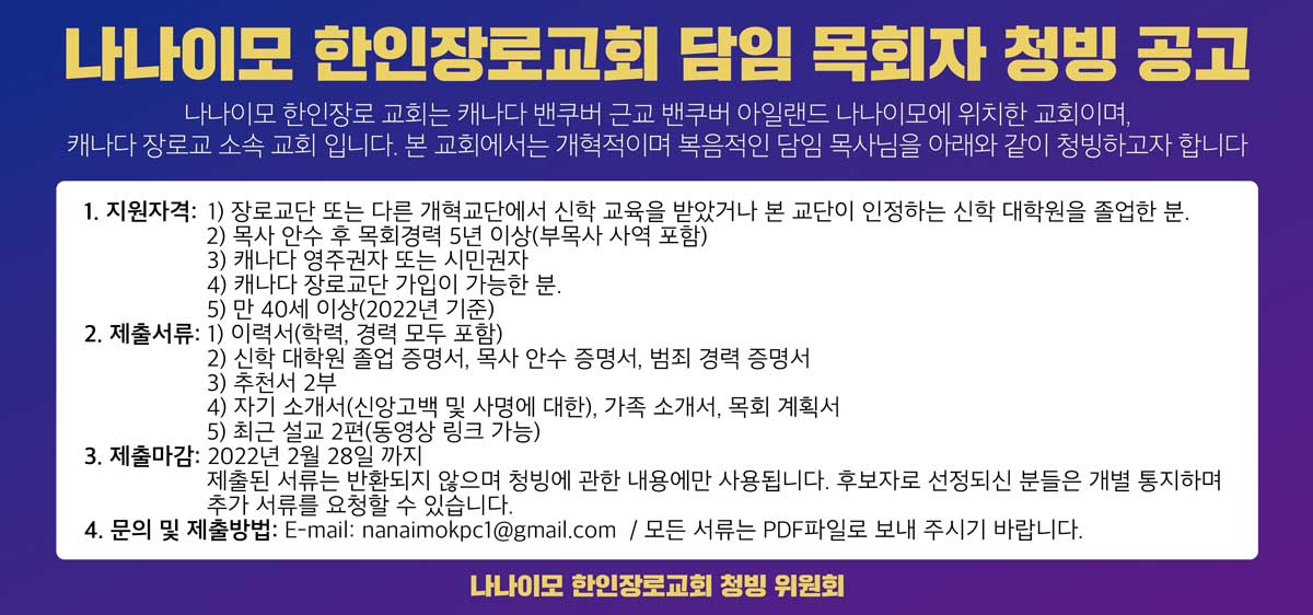 Home청빙 나나이모한인장로교회 담임목회자 청빙 공고(제출마감 기한 연장) [청빙] 나나이모한인장로교회 담임목회자 청빙 공고(제출마감 기한 연장) By admin 2월 4, 2022 나나이모한인장로교회 담임목회자 청빙 공고_제출마감 기한 연장 FacebookXWhatsAppEmailNaver Previous article[청빙] 나나이모한인장로교회 담임목사 청빙Next article[구인] 신재생에너지 기업 Green oil lnc. 드라이버 모집 Advertisment - Advertisment - 최신 청빙 [청빙] 리치먼드 주안에 교회 동역자 청빙 4월 10, 2026 [청빙] 칠리왁 주님의교회 교육전도사 청빙(연장) 3월 20, 2026 [담임목사청빙] 레스브릿지 한인교회 담임목사 청빙 3월 13, 2026 [청빙] 토론토 동산교회 반주자 청빙 3월 13, 2026 Load more 인기 청빙 [청빙] 헤브론교회 교역자 청빙 안내(8/12, 청빙완료) 7월 29, 2021 [청빙] 토론토 큰빛교회 사역자 청빙 안내 11월 4, 2021 [담임목사청빙안내] 밴쿠버한인장로교회 담임목사 청빙 안내 3월 25, 2022 [청빙] 밴쿠버 지구촌교회 청빙 안내 8월 6, 2021 Load more
