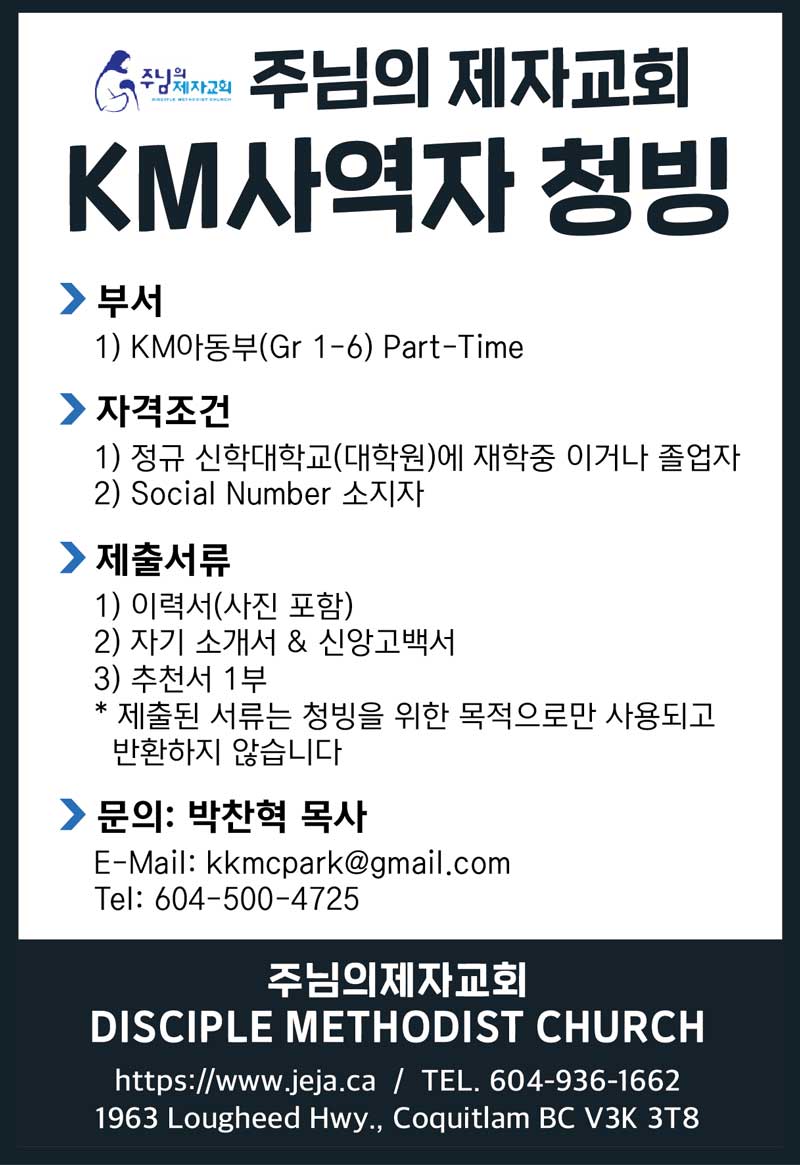 Home청빙 주님의 제자교회 KM 사역자 청빙 [사역자청빙] 주님의 제자교회 KM 사역자 청빙 By admin 3월 28, 2022 주님의 제자교회 KM 사역자 청빙 FacebookXWhatsAppEmailNaver Previous article[담임목사청빙안내] 밴쿠버한인장로교회 담임목사 청빙 안내Next article[청빙] 밴쿠버한사랑교회 사역자 청빙 Advertisment - Advertisment - 최신 청빙 [청빙] 리치먼드 주안에 교회 동역자 청빙 4월 10, 2026 [청빙] 칠리왁 주님의교회 교육전도사 청빙(연장) 3월 20, 2026 [담임목사청빙] 레스브릿지 한인교회 담임목사 청빙 3월 13, 2026 [청빙] 토론토 동산교회 반주자 청빙 3월 13, 2026 Load more 인기 청빙 [청빙] 헤브론교회 교역자 청빙 안내(8/12, 청빙완료) 7월 29, 2021 [청빙] 토론토 큰빛교회 사역자 청빙 안내 11월 4, 2021 [담임목사청빙안내] 밴쿠버한인장로교회 담임목사 청빙 안내 3월 25, 2022 [청빙] 밴쿠버 지구촌교회 청빙 안내 8월 6, 2021 Load more