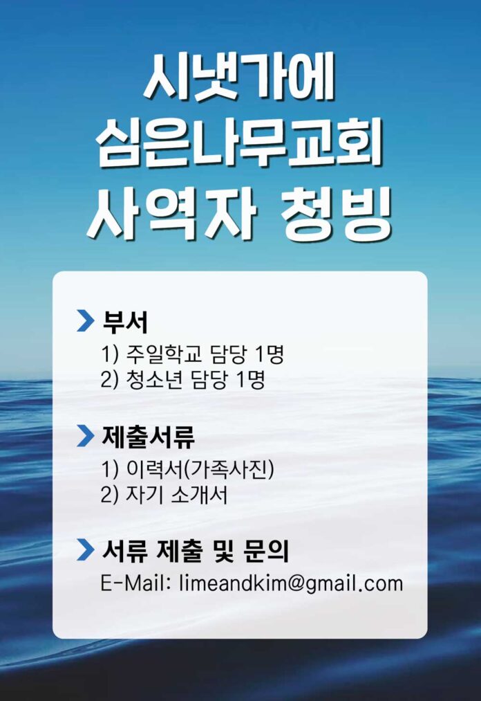 Home청빙 시냇가에 심은나무교회 사역자 청빙 [청빙] 시냇가에 심은나무교회 사역자 청빙 By admin 4월 9, 2022 [청빙] 시냇가에 심은나무교회 사역자 청빙 FacebookXWhatsAppEmailNaver Previous article[청빙] 로고스교회 사역자 청빙Next article[청빙] 밴쿠버중앙장로교회 아동부 사역자 청빙 Advertisment - Advertisment - 최신 청빙 [청빙] 리치먼드 주안에 교회 동역자 청빙 4월 10, 2026 [청빙] 칠리왁 주님의교회 교육전도사 청빙(연장) 3월 20, 2026 [담임목사청빙] 레스브릿지 한인교회 담임목사 청빙 3월 13, 2026 [청빙] 토론토 동산교회 반주자 청빙 3월 13, 2026 Load more 인기 청빙 [청빙] 헤브론교회 교역자 청빙 안내(8/12, 청빙완료) 7월 29, 2021 [청빙] 토론토 큰빛교회 사역자 청빙 안내 11월 4, 2021 [담임목사청빙안내] 밴쿠버한인장로교회 담임목사 청빙 안내 3월 25, 2022 [청빙] 밴쿠버 지구촌교회 청빙 안내 8월 6, 2021 Load more