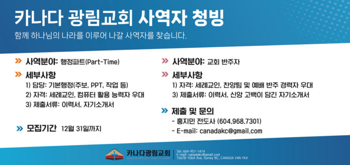 [청빙] 킹스턴한인교회 주일학교 코디네이터 청빙